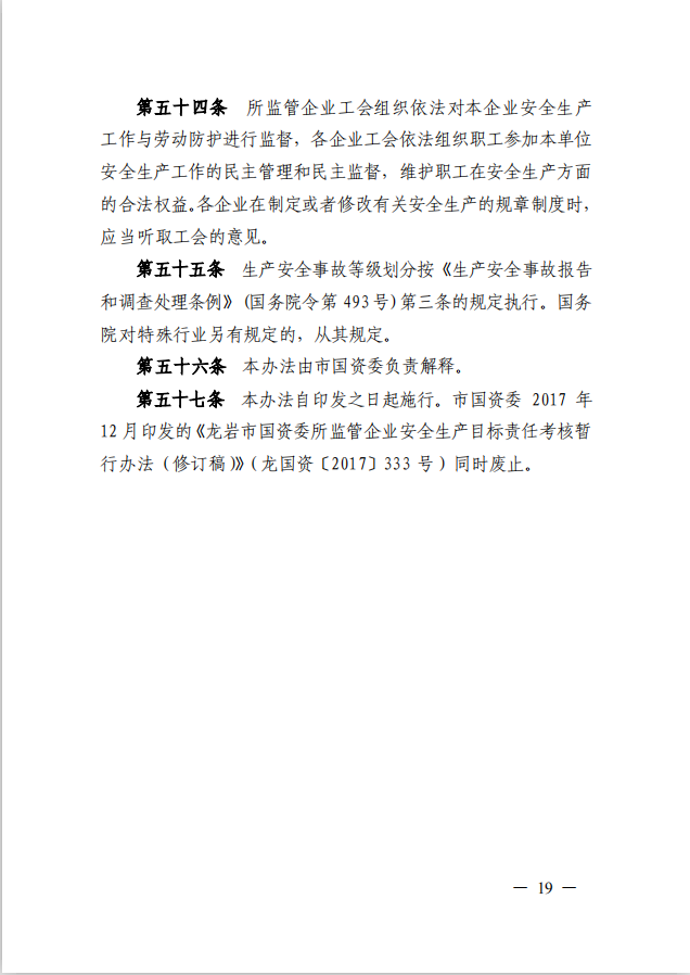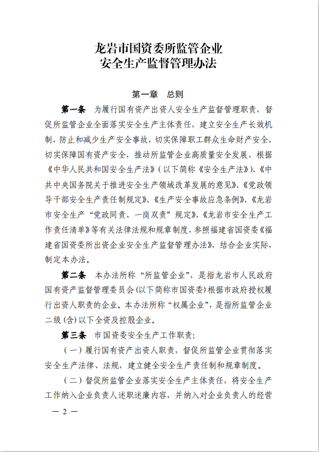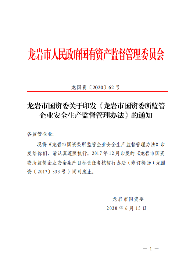 龍巖市國資委關于印發(fā)《龍巖市國資委所監(jiān)管企業(yè)安全生產(chǎn)監(jiān)督管理辦法》的通知(龍國資[2020]62號)