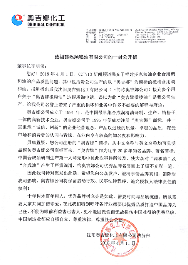 鑒于此事件對沈陽奧吉娜品牌的名譽損傷,我們特發公開信,以澄清:沈陽“奧吉娜”非福建“奧吉娜” “合成油”非“調和油”,并呼吁各行業:品牌從無到有、從小到大、從大到強,其過程的艱辛就如同培養出一個出類拔萃的優秀孩子,“中國質造”的新時代不能再靠傍大款蹭名牌投機取巧追名逐利,需要用心創新、用智鑄質才能真正打造名滿天下長盛不衰專業品牌,這樣的企業方能做到茁壯成長基業長青。