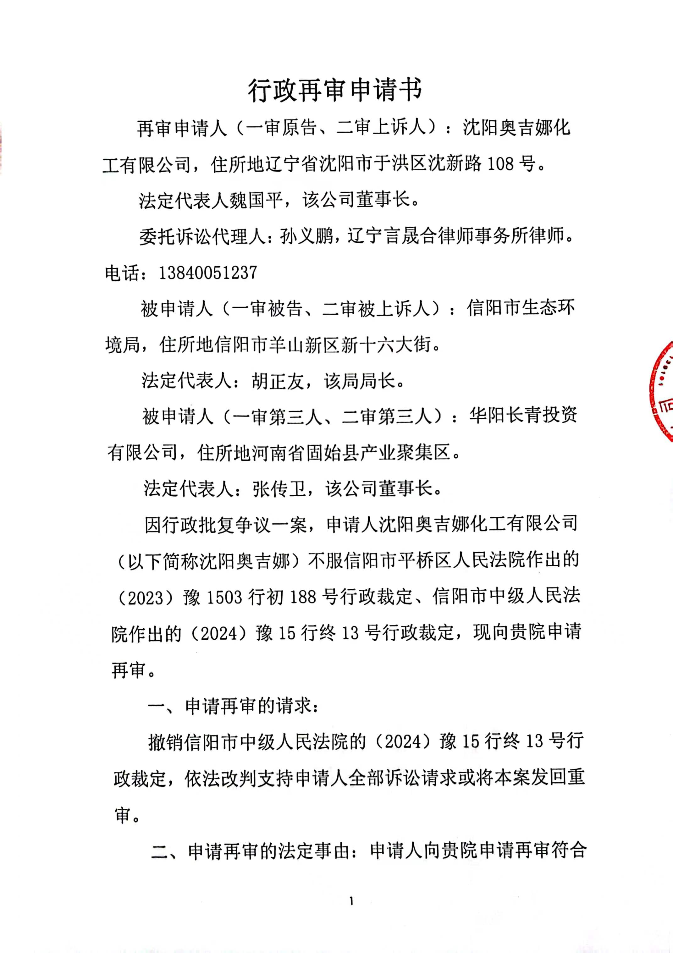 1、原告:沈陽奧吉娜化工有限公司,被告:信陽市環境局,第三人:華陽長青投資有限公司。