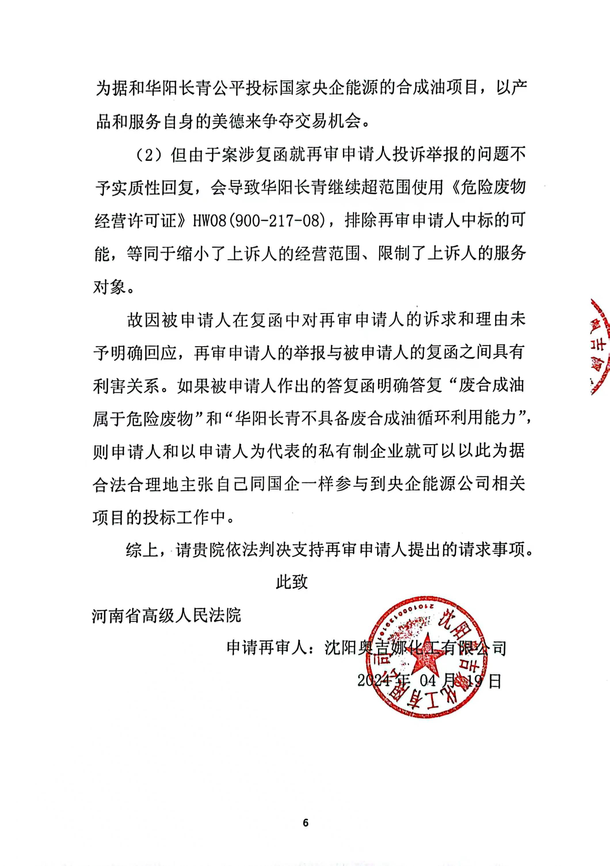 2023年3月9日,奧吉娜公司收到固始分局通過12369環境信訪平臺的短信答復:“反映問題不屬實”。3月10日,奧吉娜公司向固始分局負責人電話詢問,其解釋稱:經調查核實,華陽長青公司沒有再生風電潤滑油銷售,出售的是新油。否定了奧吉娜公司的舉報內容。對此,奧吉娜公司表示強烈不滿。3月11日,奧吉娜公司向環境部投訴固始分局的不作為和亂作為。2023年5月26日,奧吉娜公司收到12369環境信訪平臺的短信答復。答復部門為信陽環境局。令人啼笑皆非的是,答復稱,華陽長青的許可證有效期沒有問題,與舉報內容風馬牛不相及。2023年6月13日,奧吉娜公司再次向環境部提出申訴,指出,奧吉娜舉報的不是許可證有效期問題,而是許可證的適用范圍錯誤、違法。2023年7月27日,奧吉娜公司收到回復稱,經信陽市生態環境局現場檢查,未發現固始分局不作為情況。2023年8月3日,奧吉娜公司向河南省生態環境廳(以下稱:環境廳)舉報信陽環境局包庇固始分局的行為。環境廳對此高度重視,有關處長和奧吉娜公司負責人進行了面談。2023年9月13日,信陽環境局向奧吉娜公司致《信陽市生態環境局關于沈陽奧吉娜化工有限公司舉報華陽長青投資有限公司違法經營及固始分局不作為、亂作為等問題調查處理的函》。函中:一是,以“齒輪箱”替換“齒輪箱油”,偷換概念;二是,做出了廢風電合成(齒輪)油不屬于危險廢物的結論;三是,未發現固始分局存在不作為、亂作為的不當行為。再次否定奧吉娜公司的舉報和投訴。